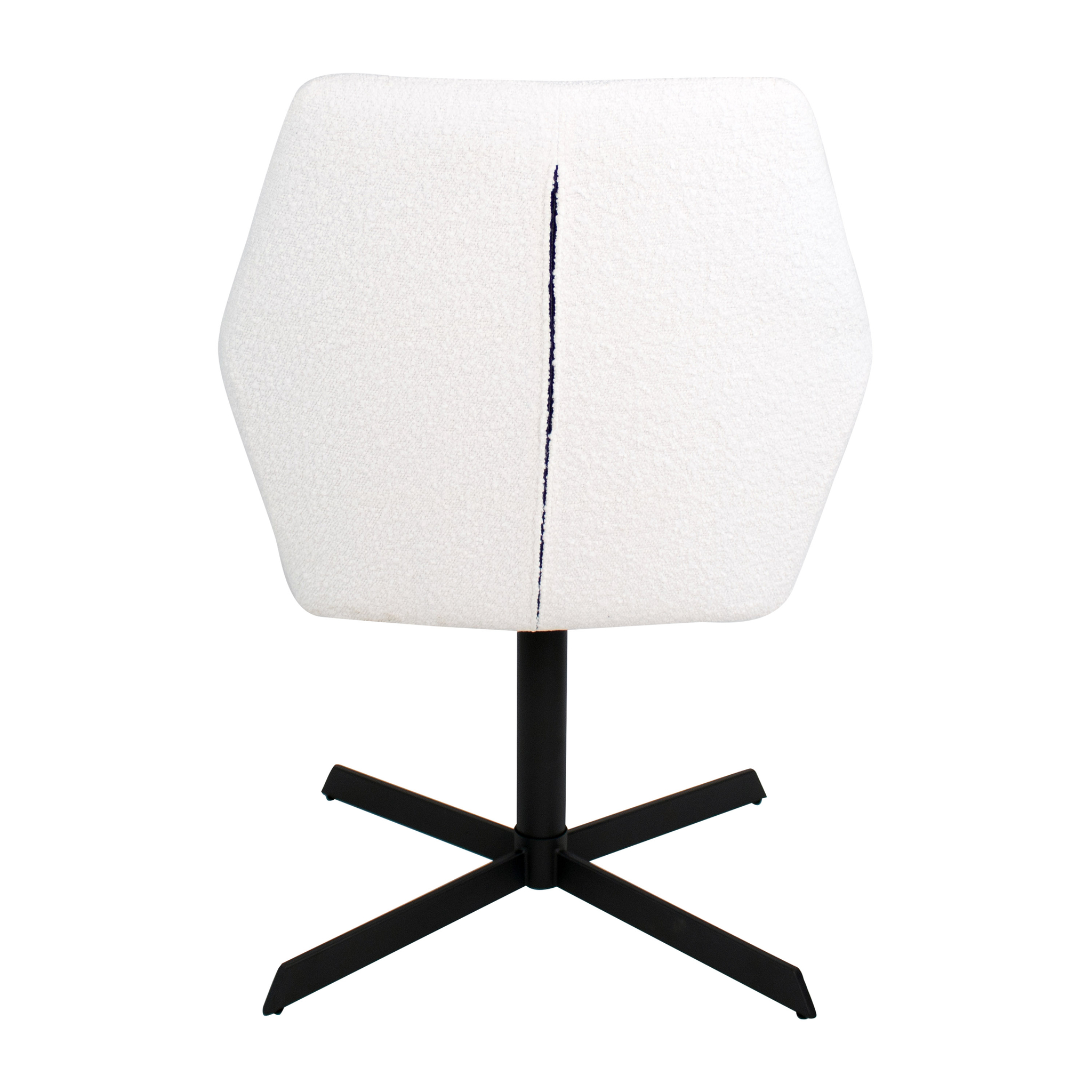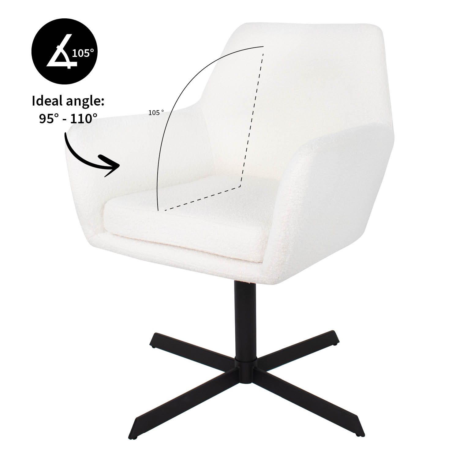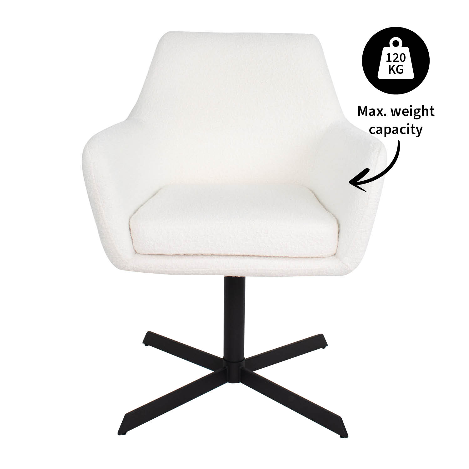 Viktor is gehuld in een zachte bouclé stof en verkrijgbaar in diverse kleuren. De stoel is voorzien van goed gepositioneerde armleuningen waardoor het zitcomfort optimaal wordt. Het opvallende metalen frame van de stoel is een staaltje van modern design en functionaliteit. Het frame is voorzien van een 360-graden draaimechanisme, waardoor je soepel kunt bewegen en gemakkelijk kunt aanschuiven aan de eettafel of een gesprek kunt voeren zonder de stoel te verschuiven.