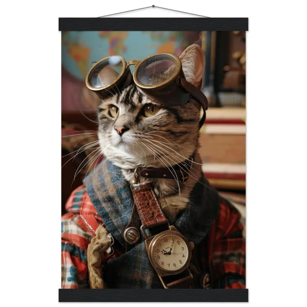 Dit schilderij toont een elegante kat, gekleed in een prachtige vintage steampunk outfit. Hij draagt een geruite jas in warme tinten zoals rood en blauw, versierd met fijne stiksels en leren accenten. Om zijn nek hangt een antieke, bronzen klok, die zijn geraffineerde look versterkt. Zijn kop wordt gesierd door een paar grote, retro-futuristische brillen met metalen details in een koperkleurige afwerking, wat hem de uitstraling van een avontuurlijke ontdekkingsreiziger geeft. Zijn poten zijn voorzien van stoere, leren manchetjes. De achtergrond bevat een wereldkaart, wat bijdraagt aan het gevoel van reizen en avontuur.