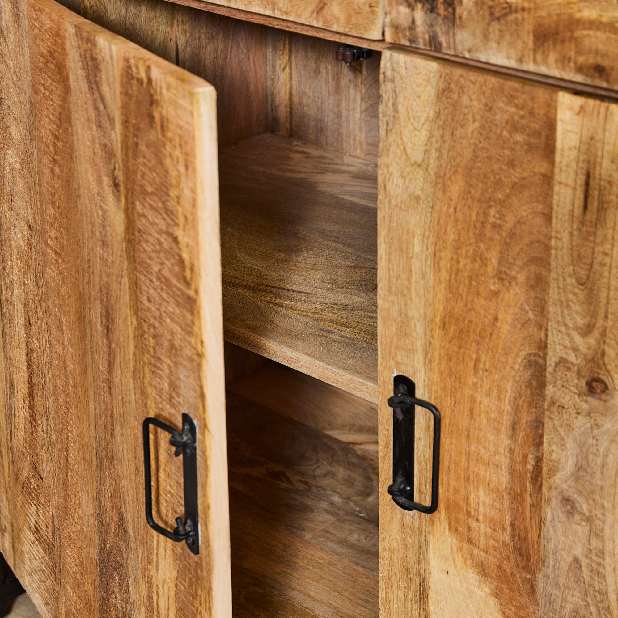 Vitrinekast Boaz is uitgevoerd in het mangohout. Het metalen frame en de metalen handgrepen zijn afgewerkt met een zwarte lak. Dit model is voorzien van twee lades en vier deuren. Achter de deuren zitten handige legplanken. De vitrinekast is ingelegd met verschillende stroken gelakt hout, waar het meubel zijn eigentijdse karakter aan te danken heeft.
